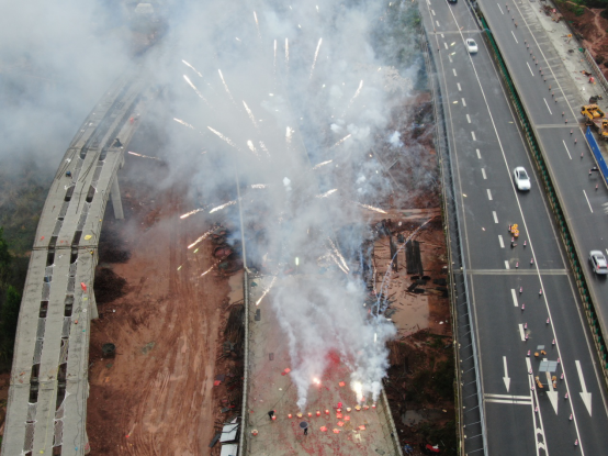 11月24日10時18分,隨著新店樞紐互通G匝道橋最后一片小箱梁被吊裝設(shè)備穩(wěn)穩(wěn)安放在最后一跨墩柱上,現(xiàn)場慶祝的煙花頓時直沖云霄,鞭炮聲、歡呼聲、吶喊聲響成一片。對于參與新店樞紐互通施工的每一個參建者來說,這是一個激動人心的時刻。新店樞紐互通最后一片箱梁順利架設(shè)成功,標(biāo)志著整個新店樞紐互通主體結(jié)構(gòu)施工全面完工,提前6天完成了營達公司下達的目標(biāo)任務(wù)。